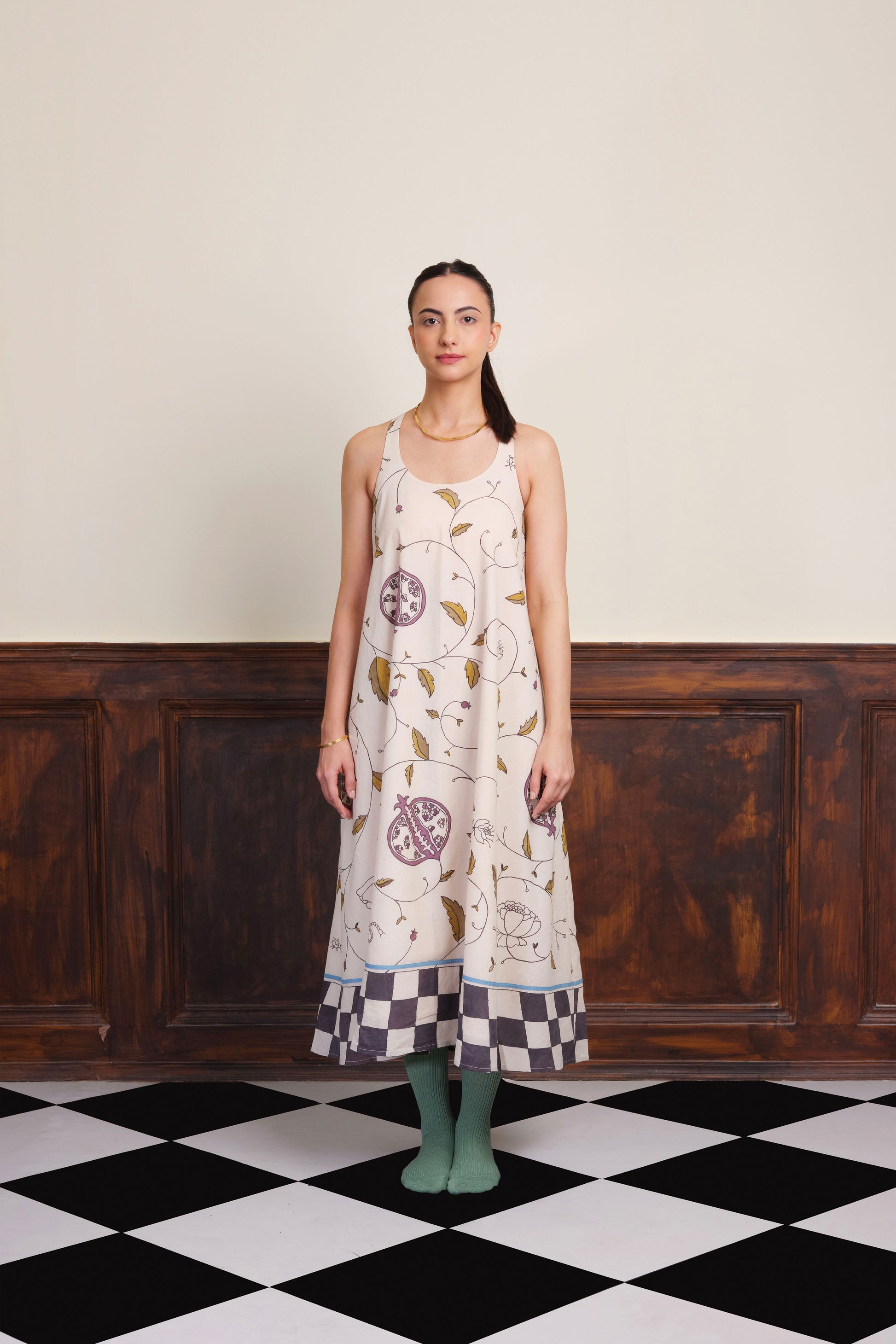 A strappy A-line relaxed dress with a cross back and a shirred back panel. It is painted with myrobalan, alum, lac, and kassim. It also has a small indigo blue patch running above the kassim border. Shell and lining made with 100% cotton.