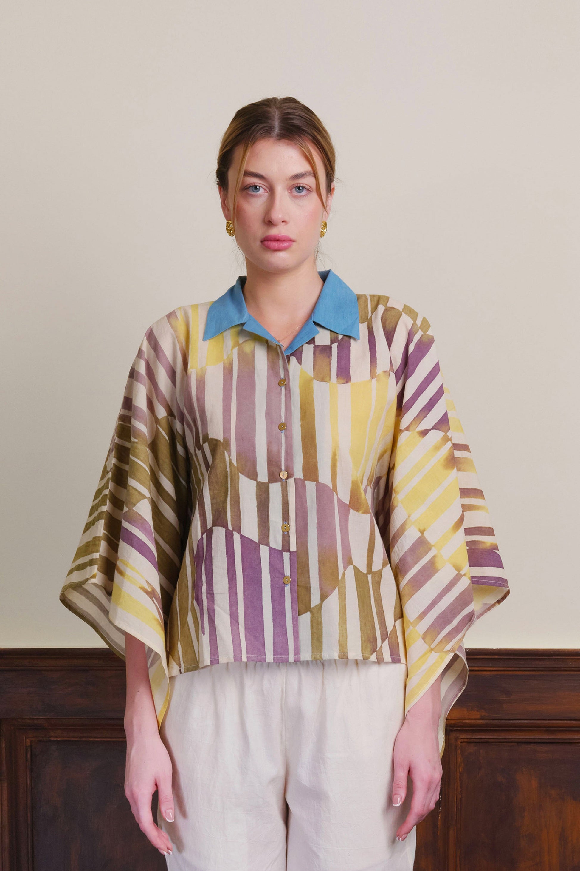 A relaxed kaftan stitched-down shirt with a notch collar. The front and back are painted with lac, madder, sappanwood, alum, myrobalan, and turmeric. The collar features contrast indigo blue.