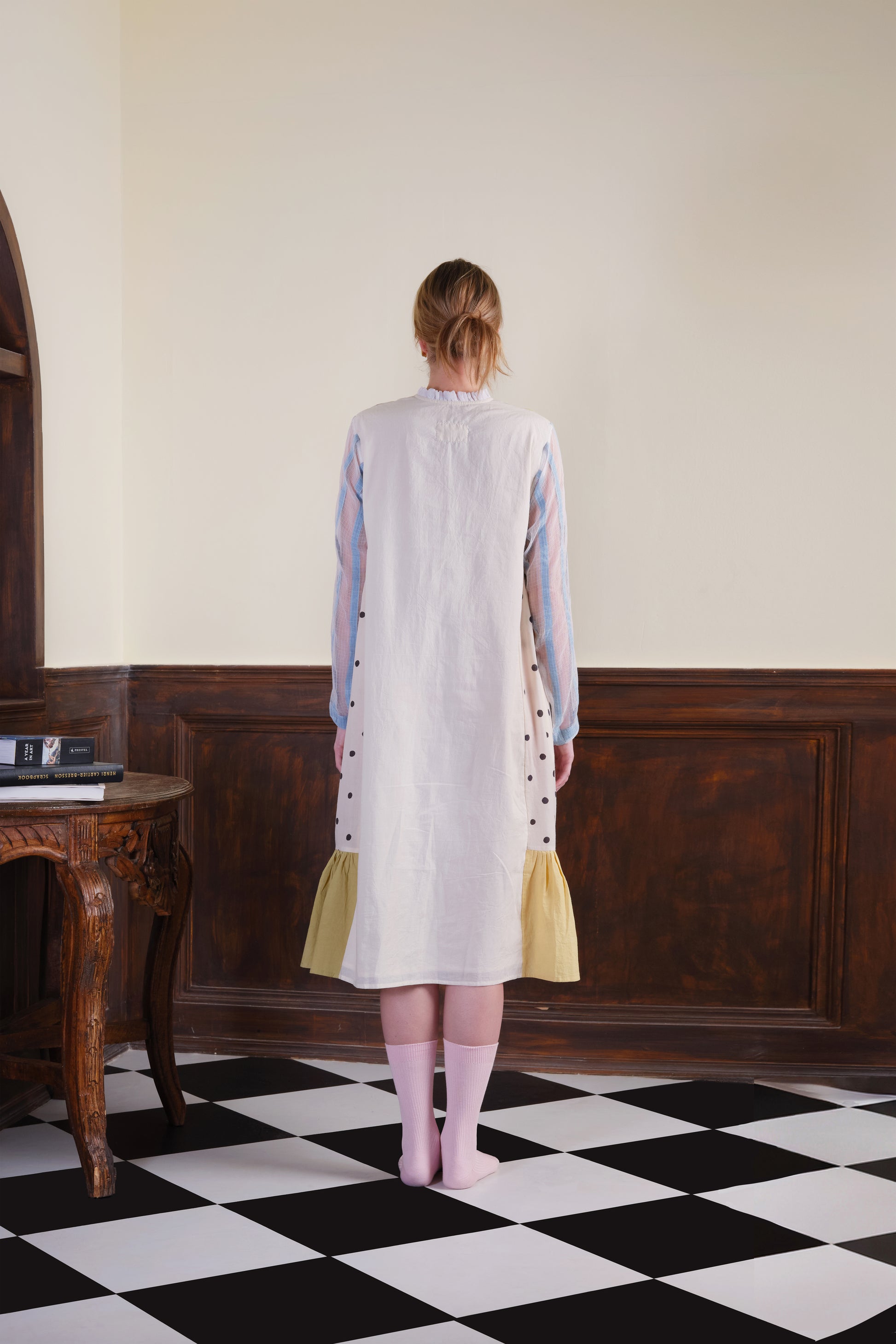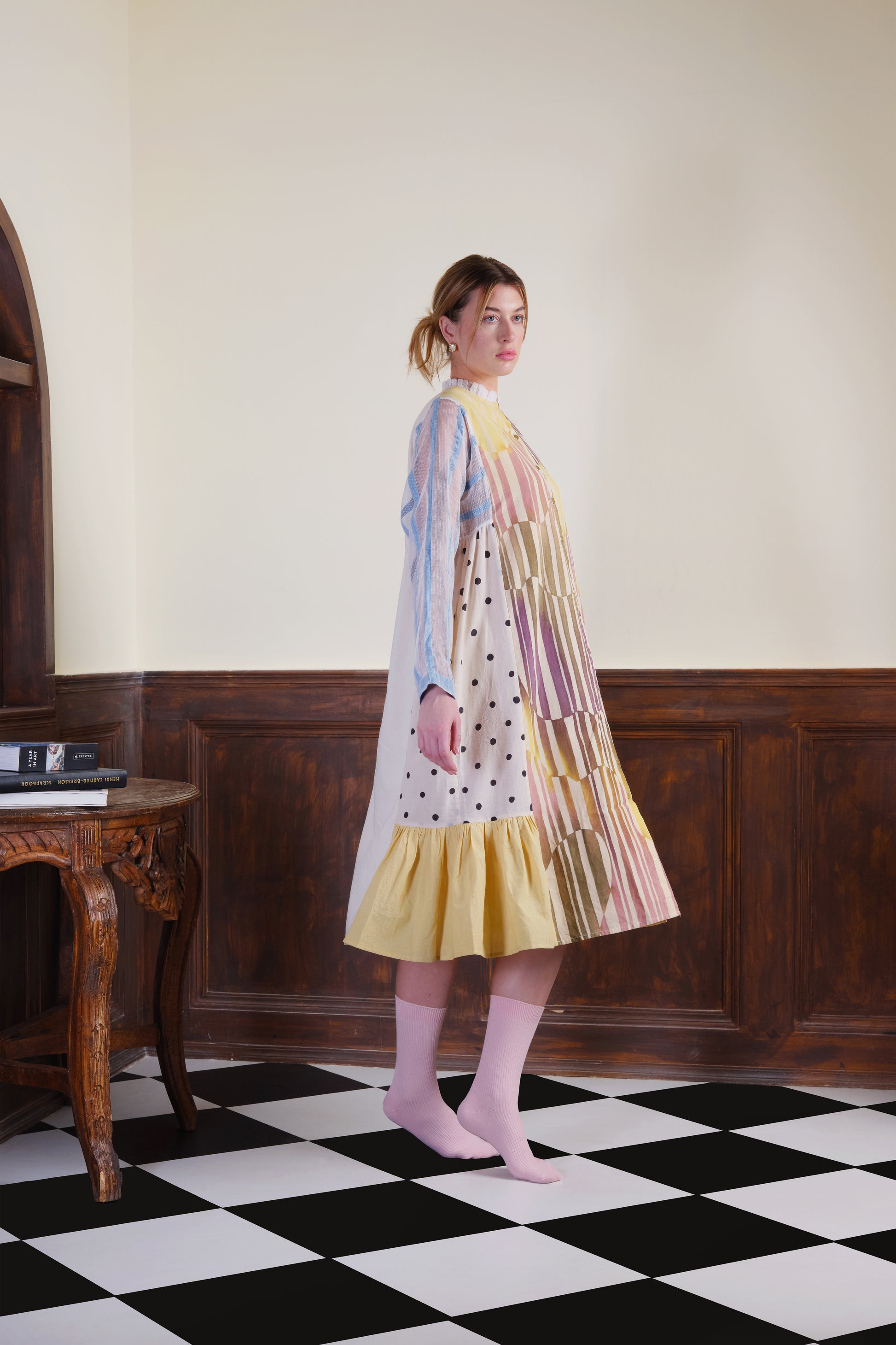 It is a multi-panel, button down, relaxed fitted dress with gathered high neck. Mixed-print is painted with kassim, pomegranate, myrobaln, alum, turmeric, madder, sappanwood and lac. It featured kota doria fabric with patch indigo sleeves and side gathers in pomegranate and myrobalan. The buttons are handmade using brass. Shell and lining made with 100% cotton.