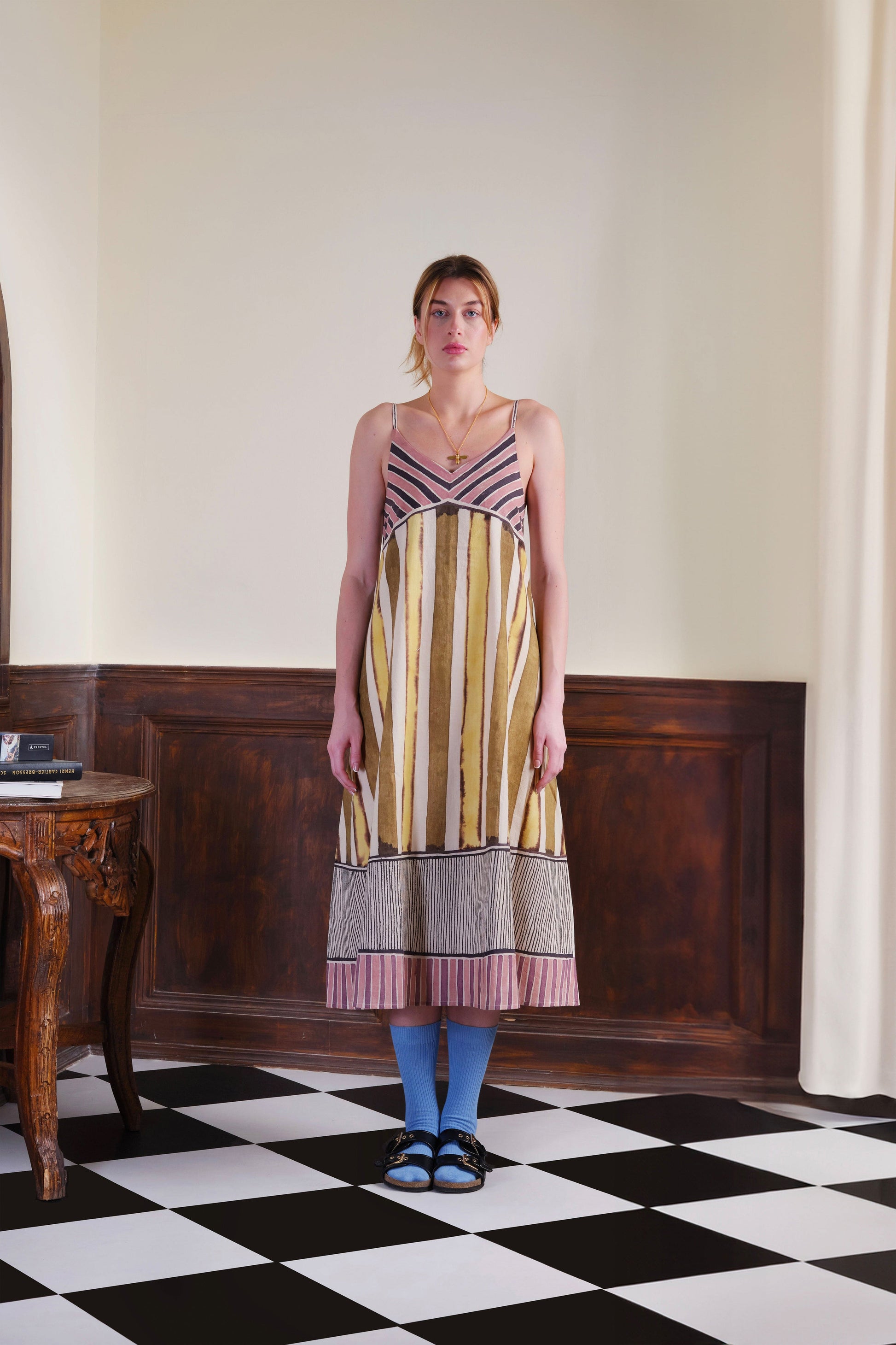 A strappy A‑line relaxed slip dress with panelled vertical lines. The fabric is painted with kassim, myrobalan, alum, madder, sappanwood and lac. Shell and lining made with 100% cotton.